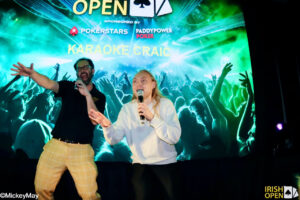 First up is my beer pong buddy Christoffer, alongside RecPoker stalwart, Jim Reid. They give us a rousing rendition of The Backstreet Boys’ Everybody. (Editor’s note: What it should sound like) It’s a marvellous curtain-raiser and a tough act to follow. But follow they do… Some highlights include: fellow Irish Open reporter Chris Bean with a bravura version of This Charming Man – and Lydia Cugudda, fresh from her 2nd place finish in the Ladies Championship, giving a high-energy performance of The Foo Fighters’ Times Like These which goes down a storm.
