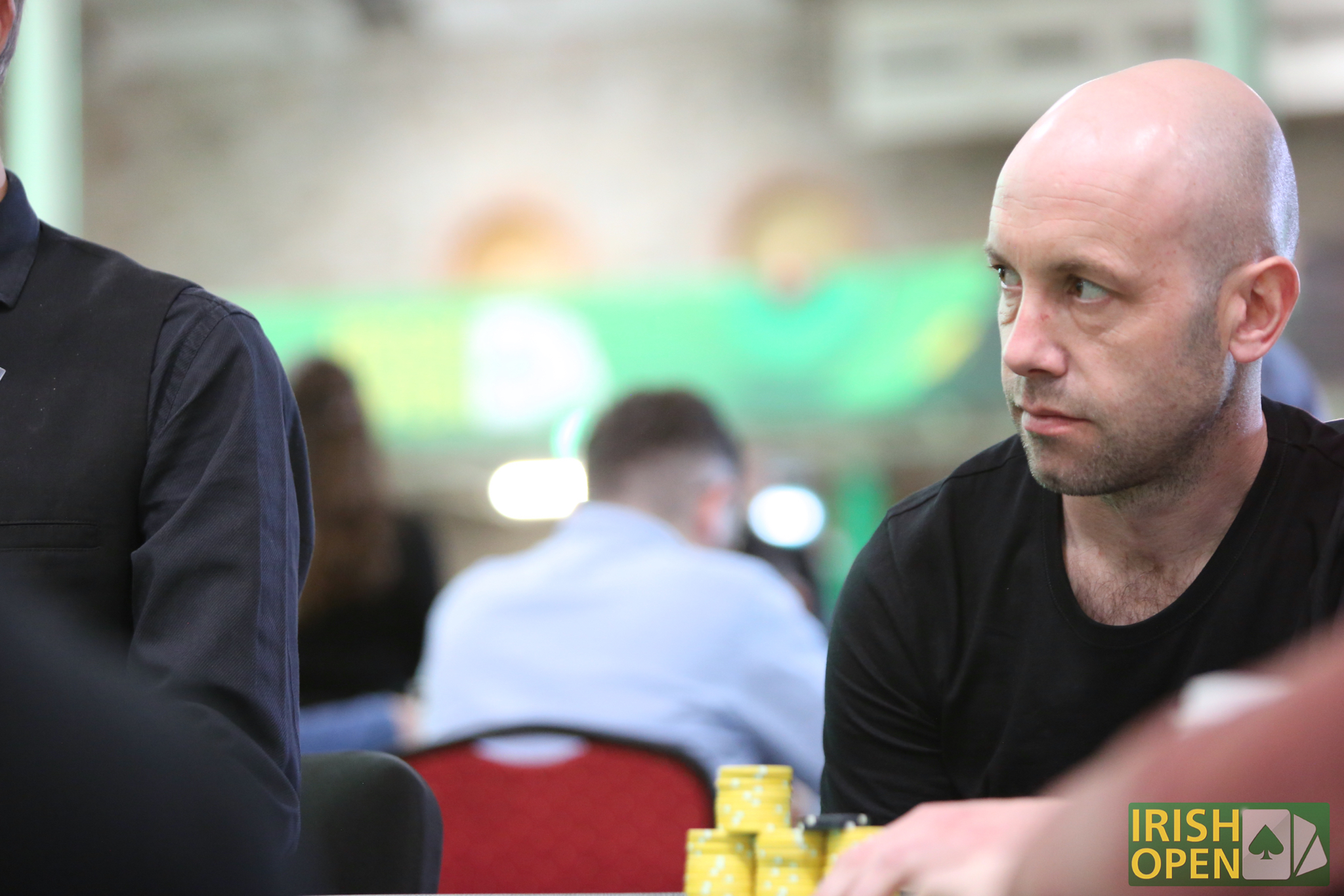 With around 15,000 in the middle on a board of , Trevor Dinneen had overbet jammed for 21,000, and Cathal Dolan was in the tank.