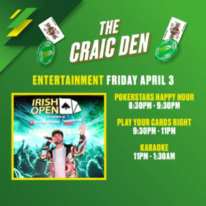 Thank you PokerStars for hosting Happy Hour tonight from 8.30pm-9.30pm. For full details of all the entertainment planned for the Craic Den this year, click our schedule story.