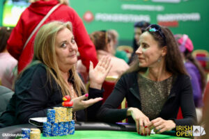 We also still have ebullient Irish Open stalwart Deborah Worley-Roberts in the field – and you can probably hear her from most parts of the tournament room. Debs the Destroyer (below, left) has an amazing track record in Ladies Events including a WSOP runner-up finish. Also still in is our very own Friend of the Irish Open Elizabeth Bennett-Martin.