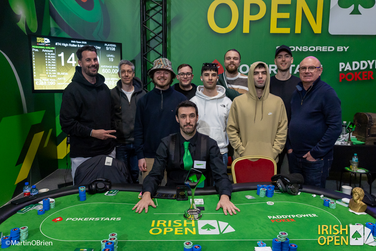 The penultimate day of the 2026 Irish Poker Open has seen yet another winner crowned as Event #74 €3,000 High Roller 8-Max has come to a conclusion. Out of a field of 108 entries, Giuseppe Dedoni defeated Ranno Sootla in heads-up play with both players earning the biggest slice of the €288,090 prize pool.