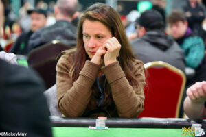 It was a bit of a setup with Kalantzi with a premium and Duffy with a callable hand. A clean board of secured the double up for one of two women left in the field. Charlie Waters is also in contention with a stack of 1,700,000 chips.