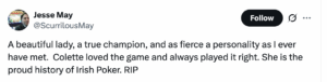 At his mother’s funeral, Peter quoted Padraig’s fitting phrase to describe the Irish poker legend that was Colette Doherty. When Padraig heard the words, he thought to himself, “I don’t recall saying that, but I hope I did, because it’s brilliant”. He went home, browsed the archives, and sure enough, they were his words. It should be a fitting way to end this homage too: