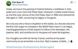 Doherty died in February this year at the age of 88. She is much missed by her many friends and family, but also the wider Irish and global poker communities. Without even trying, Doherty paved the way for women in poker and was a trailblazer for the game in Ireland. Not only was Colette a two-time Irish Open champion, she was also the first Irish player – and one of the first women – to compete in the World Series of Poker in Las Vegas.