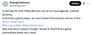 At his mother’s funeral, Peter quoted Padraig’s fitting phrase to describe the Irish poker legend that was Colette Doherty. When Padraig heard the words, he thought to himself, “I don’t recall saying that, but I hope I did, because it’s brilliant”. He went home, browsed the archives, and sure enough, they were his words. It should be a fitting way to end this homage too: